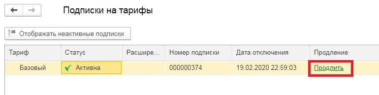 Подписка будет продлена. В окне Подписки на тарифы в столбце Продление будет выведена надпись о том, что подписка была продлена и до какого момента времени она была продлена.